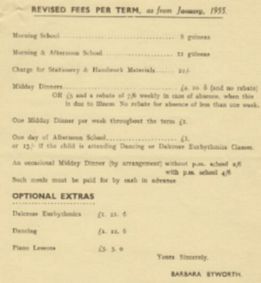 AFTERNOON SCHOOL: 2.10 p.m. to Form VI 3.50 p.m. Form V 3:45 p.m. Form IV 3:40 p.m. Forms I, II, III 3:35 p.m Children can remain at school all day and have their Midday Meal here too, in which case they will need a table napkin, two spoons, two forks and a knife (if old enough to use one without help) SCHOOL FEES (Revised as from January, 1955) PER TERM Morning School ....... 8 guineas [2023 equivalent ....... £274] Morning & Afternoon School ....... 12 guineas [2023 equivalent ....... £411] Charge for Stationery & Handiwork Materials...... 10/- [£16] Midday Dinners ....... £4. 10s. 0d. (and no rebate) [2023 equivalent ....... £147] OR £5 [£163] and a rebate of 7/6 [£12] weekly in case of absence due to illness. No rebate for absence of less than a week. One Midday Dinner per week throughout the term ....... £1 [£32] One day of Afternoon School ....... £1 [£32] or 15/- [£24] if the child is attending Dancing or Dalcroze Eurythmics Classes An occasional Midday Meal (by arrangement) without p.m. school 2/6 [£4] with p.m. school 4/6 [£8] Such meals must be paid for by cash in advance OPTIONAL EXTRAS Dalcroze Eurythmics ....... £1. 11s. 6d. [£51] Dancing ....... £1. 11s. 6d. [£51] Piano Lessons ....... £3. 3s. 0d. [£103] Yours Sincerely BARBARA BYWORTH Example of receipt for fees paid CLOTHES LISTS & OTHER REQUIREMENTS WINTER UNIFORM BOYS Grey Overcoat and/or Grey Raincoat Blue School Cap (a) and badge (b) Grey shorts Blue shirts (a) or blouses (b) (with short collars) Blue tie (a) Grey Blazer OR cardigan OR pullover Grey socks GIRLS Grey Overcoat and/or Grey Raincoat Blue beret (a) and badge (b) Blue Dayella blouses (Peter Pan collars) Grey flannel flared strap skirt with pocket NO TIE for girls Grey or blue (if very good match) cardigan Grey socks If a scarf is worn, it must